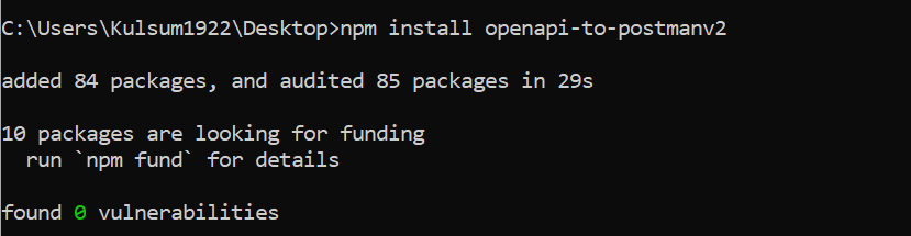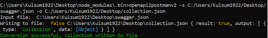 openapi2postmanv2 -s C:/Users/Kulsum1922/Desktop/swagger.json -o C:/Users/Kulsum1922/Desktop/collection.json